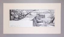 Label TextThis drawing is one in a series of original ink wash drawings created by Olin Dows for his book, "Franklin Roosevelt at Hyde Park," published in 1949 by American Artists Group, Inc. Olin Dows spent two years writing the text and drawing the book's 174 illustrations. This illustration appears on pages 142 and 143 of the book. The image is a variation of a 1941 final study (see MO 1968.15.2) done by Dows for the River Landing panel of a mural in the Hyde Park, New York post office.The drawing is mounted to a piece of cardboard and comes with a window mat.