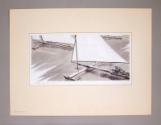 The drawing is mounted to a piece of cardboard and comes with a window mat on which the title is written in pencil: Iceboating.