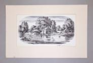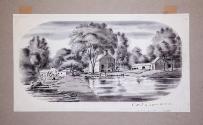DescriptionAn original pen and ink and ink wash drawing with gouache highlights of the Dickinson grist and saw mill built pre-1797 by Dr. John Bard. Three various-sized buildings are laid out in a row along the bank of a body of water. A horse-drawn wagon is pulled up in front of the center building, while out on the water a person is fishing from a rowboat. The drawing is signed by the artist in ink in the lower right below the image: Olin Dows © 1949.