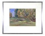 The painting is matted, glazed, and framed in a 1/2" silver-painted wood frame. A label on the reverse of the frame indicates it was framed by Arax in Poughkeepsie, New York.