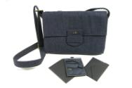 DescriptionA medium blue wool travel handbag. On one side it is a regular handbag with Eleanor Roosevelt's gilt initials (ER) on the exterior of the flap and an interior with gray leather compartments, a card holder, a mirror, and a change purse. On the other side of the handbag is a section which unfolds like a shopping bag and has two zippered pockets. This section is held folded to the purse by two fabric straps with brass buckles. The maker's mark is on the interior of purse: "Cartier."