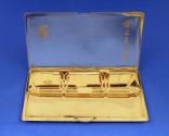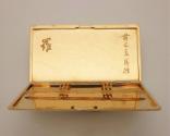 DescriptionA hinged, rectangular-shaped gold cigarette case with a simple exterior design of raised diagonal lines. The interior of the case has a reflective finish with a decorative, cut design bar to hold cigarettes in place. Engraved on the interior of the cover is an inscription in Chinese characters that translates to: To Roosevelt / Gift from Chiang Kai-shek and Soong Mei-Ling.