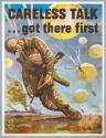 DescriptionA color poster featuring an illustration of an injured or dead soldier, with visible wounds, attached to a parachute and just reaching the ground. In the sky behind him are airplanes and other descending parachutists, while several burning fires are visible in the distant left background. Black text at the top of the poster reads: CARELESS TALK / . . . got there first. The facsimile signature of artist Herbert Morton Stoops is in the lower right corner of the illustration.