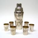 DescriptionA Chinese cocktail set made of silver. Each piece has a bamboo motif and unidentified Chinese characters appear on the undersides. The set consists of: