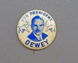 DescriptionA round pinback button from Thomas Dewey's campaign. At the center of the white button is a blue halftone photographic image of Thomas E. Dewey with blue text above and below that reads: FOR PRESIDENT / DEWEY. Flanking each side of Dewey's image is the illustration of an elephant.