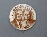 DescriptionA round pinback campaign jugate button. At the center are sepia halftone illustrated portraits of Franklin D. Roosevelt and Harry Truman. Brown text at the top and bottom reads: ROOSEVELT / TRUMAN.