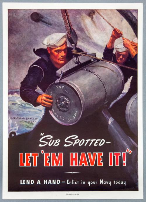 McClelland Barclay designed posters and naval camouflage during World War I. After the war, he became a leading magazine illustrator and painted poster art for Hollywood studios. Barclay enlisted in the U.S. Naval Reserve in 1938. He reported for active duty in October 1940 and created some of the Navy’s most memorable recruiting posters. In 1943, Barclay volunteered to be a combat artist. On July 18, 1943, he died when his ship was torpedoed near the Solomon Islands.