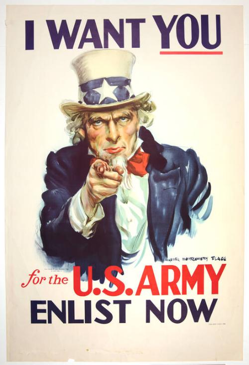 Perhaps the most recognizable poster in American history, James Montgomery Flagg’s depiction of Uncle Sam pointing at the viewer first appeared as a cover illustration for "Leslie’s Weekly" magazine on July 6, 1916. In that original version Uncle Sam asks: “What are YOU doing for preparedness.” Flagg used himself as a model for the illustration. His inspiration came from a British military recruiting poster created in 1914 by Alfred Leete that featured Lord Kitchener, the United Kingdom’s Secretary of State for War, pointing at his audience while asserting “Your Country Needs YOU.”