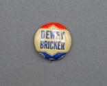 Physical DescriptionA round pinback button from the campaign of Thomas Dewey and John Bricker. The button consists of three horizontal bands in red, white, and blue. Printed on the wider white center band, which has v-notched borders, is blue text that reads: DEWEY / BRICKER. The manufacturer's information, and a union bug, are printed along the rim.