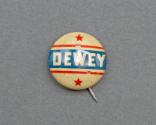 Physical DescriptionA round pinback button from Thomas Dewey's campaign. On a white button is a broad blue horizontal band at center with white text that reads: DEWEY. The blue band is accented both above and below by a red star and thinner red band.
