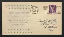 Physical DescriptionA 1944 campaign stamp cover with an anti-Roosevelt cachet. The white envelope bears a violet U.S. 3¢ Win the War Issue stamp (Scott 905). On the left side of the envelope is a silver and black cachet consisting of text that reads: Again, again and again / -F.D.R., Boston, Oct. 30, 1940- / "Your boys are not going / to be sent into any / foreign wars!" The text is bordered above and below by rows of stars.