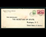 Physical DescriptionA white stamp cover from the American Consular Service in Bermuda. The envelope is addressed to (pre-printed): THE HONORABLE / THE SECRETARY OF STATE, / Washington, D. C. / United States of America. Hand written in ink in the lower left corner: Visa. The return address is in the upper left corner. Adhered in the upper right corner of the envelope is a Bermudian 1910-1920 light green ½p Caravel postage stamp (Scott 41), and two Bermudian 1910-1920 rose 1p Caravel postage stamps (Scott 42). The envelope is postmarked Hamilton, Bermuda, June 13, 1934.