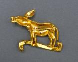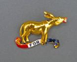 Physical DescriptionA gold-colored metal pin, from Franklin Roosevelt's campaign, in the shape of a donkey. Colored enamel accents the donkey's mane, head, and hooves. The donkey stands on a red, white, and blue enamel-covered pennant with the initials FDR at the center. The donkey has a pin backer.