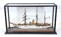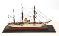 Physical DescriptionA model of the U.S. Coast Guard Cutter, BEAR. The ship has a white and red painted wooden hull, three masts with no sails, one smokestack, and several lifeboats. The model is affixed to a wooden base, the surface of which simulates the sea. Attached to the base is a metal plaque inscribed: COAST GUARD CUTTER / BEAR / BUILT 1874 SCOTLAND". The model and base are attached to a larger wooden base which has a perimeter groove to allow for the placement of a protective bonnet.