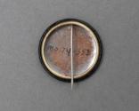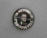 Physical DescriptionA round pinback memorial button. At the center of the black button is a grayscale photographic image of Franklin D. Roosevelt. Encircling the image is white text that reads: IN MEMORY OF / F. D. ROOSEVELT / APR. 12 1945.