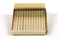 Physical DescriptionThirteen unsmoked Russian unfiltered cigarettes, the brand name marked on each. The cigarettes are in the original packaging, consisting of a box made of black, gold, and off-white cardboard. On the cover is the brand name and an illustration of a city scene, predominantly in blue, with red and white firecrackers going off in the sky. On the underside of the box is printed information in Cyrillic, including the maker's mark.