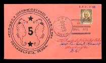 Physical DescriptionA salmon-colored stamp cover commemorating the 1935 decommissioning of the U.S. Navy submarine, USS S-48. On the left side of the envelope is a stamped black ink cachet consisting of a double-banded circle within which is “★ 5 ★” flanked by seahorses. Wrapped around the outside of the circle is text that reads: USS S48 / DECOMMISSIONED / USS S48 / PHILADELPHIA, PENNA. The cachet designer’s name is within the double bands: DR. HUTNICK, 1935. To the right of the cachet is an embossed seal for U.S. Submarines in the Department of the Navy.