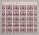 Physical DescriptionA full pane of fifty unused U.S. 1940 brown-violet 3¢ Wyoming Statehood stamps (Scott 897) showing an image of the Wyoming State Seal. The pane is from stamp sheet no. 22584. The top margin of the pane has the original ink signatures of "Henry Morgenthau Jr." and "Franklin D. Roosevelt."