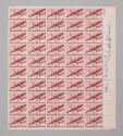 Physical DescriptionA full sheet (no. 22765) of fifty unused U.S. 1940 brown-carmine 15¢ Air Mail stamps (Scott C28) showing an image of a twin-motored transport plane. The right margin of the sheet has the original ink signatures of "Henry Morgenthau Jr." and "Franklin D. Roosevelt."