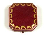 b) A red and gold leather presentation and storage box for the watch. The interior of the lid is lined with white satin and has a gilt Cartier maker's mark.