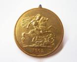 Physical Descriptiona) A yellow gold coin-form watch. The exterior of the case's hinged lid features a right-facing relief profile of the head of King Edward VII of England encircled by text that reads: EDWARDVS VII DEI GRA: BRITT: OMN: REX FID: DEF: IND: IMP:. The reverse side of the case features a relief image of a warrior on horseback slaying a dragon (possibly Saint George and the Dragon), below which is the date "1902." A small, blue enamel button on the top of the case releases the lid to reveal a Cartier watch with a white dial and black hands and numeral hour markers. The number 9308 is stamped inside the lid.