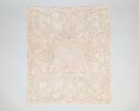 Physical DescriptionA linen lace on silk net handkerchief. The handkerchief has an approximately 4" x 4" plain, fine linen center with a flower and scroll design on the 4 1/2" lace border.