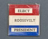 Physical DescriptionA square emblem, evidently meant to be worn as a campaign button (though there no longer is a pin) for political rivals Franklin Roosevelt and Thomas Dewey. The square is divided into horizontal thirds of red (top), white (center), and blue (bottom) with black text that currently reads: ELECT / ROOSEVELT / PRESIDENT.