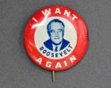 Physical DescriptionA round pinback button from Franklin Roosevelt's campaign. At the center, on a white background, is a blue halftone photographic image of FDR. Encircling the edge of the button is a broad red band. White and blue text on the red band and in the center reads: I WANT / ROOSEVELT / AGAIN. A union bug is imprinted on the right edge.