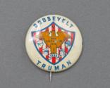 Physical DescriptionA round pinback button from the campaign of Frankllin Roosevelt and Harry Truman. At the center of the white button is a red, white, and white striped shield on which is superimposed a gold eagle with the motto in blue: ONE / ALL FOR ONE / ALL. Above the eagle is a blue V and below the date 1944. Flanking the eagle are the illustrated heads of four servicemen representing the Navy, Marines, Air Force, and Army. Above and below the shield is blue text that reads: ROOSEVELT / TRUMAN. The manufacturer's information is printed along the edge: Copyright • 1944, Anthony G. Georgeson.