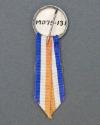 Attached to the button is a folded-over red, white and blue striped ribbon from which a miniature metal horseshoe is suspended.