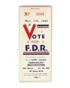 Physical DescriptionA small book of stickers from Franklin Roosevelt's campaign. The cover of the book is aligned vertically and has red and blue text, on a white background, that reads: No. 6900 / Nov. 7th, 1944 / VOTE / FOR / F.D.R. / All remittances to be sent to / A. D. KANER, Chairman / DEMOCRATIC / HEADQUARTERS / 6802 Delmar Tel. DE. 0264 / 100 Stamps $1.00 / Seal your letters with these stamps. / Do not put on mail to men in service. A St. Louis, Missouri union bug and the number "59" are printed at the bottom of the cover.