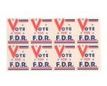 Stapled and stored inside the book are ten pages worth of stamp-sized stickers - six complete attached pages of 10 stamps each; four attached partial pages with 2 stamps each; and four separated partial pages of 8 stamps each. The identical red, white, blue stickers on each page read: VOTE / FOR / F.D.R. The last page of the book consists of a form that users can fill out.
